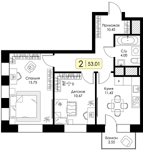 Двухкомнатная квартира №163 с чистовой отделкой, Корпус 5, Секция 1