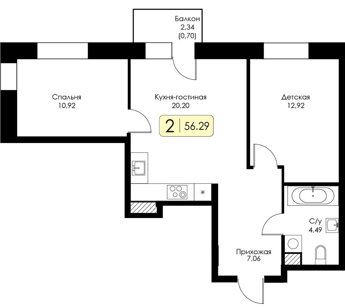 Двухкомнатная квартира №51 с чистовой отделкой, Корпус 1.1, Секция 1