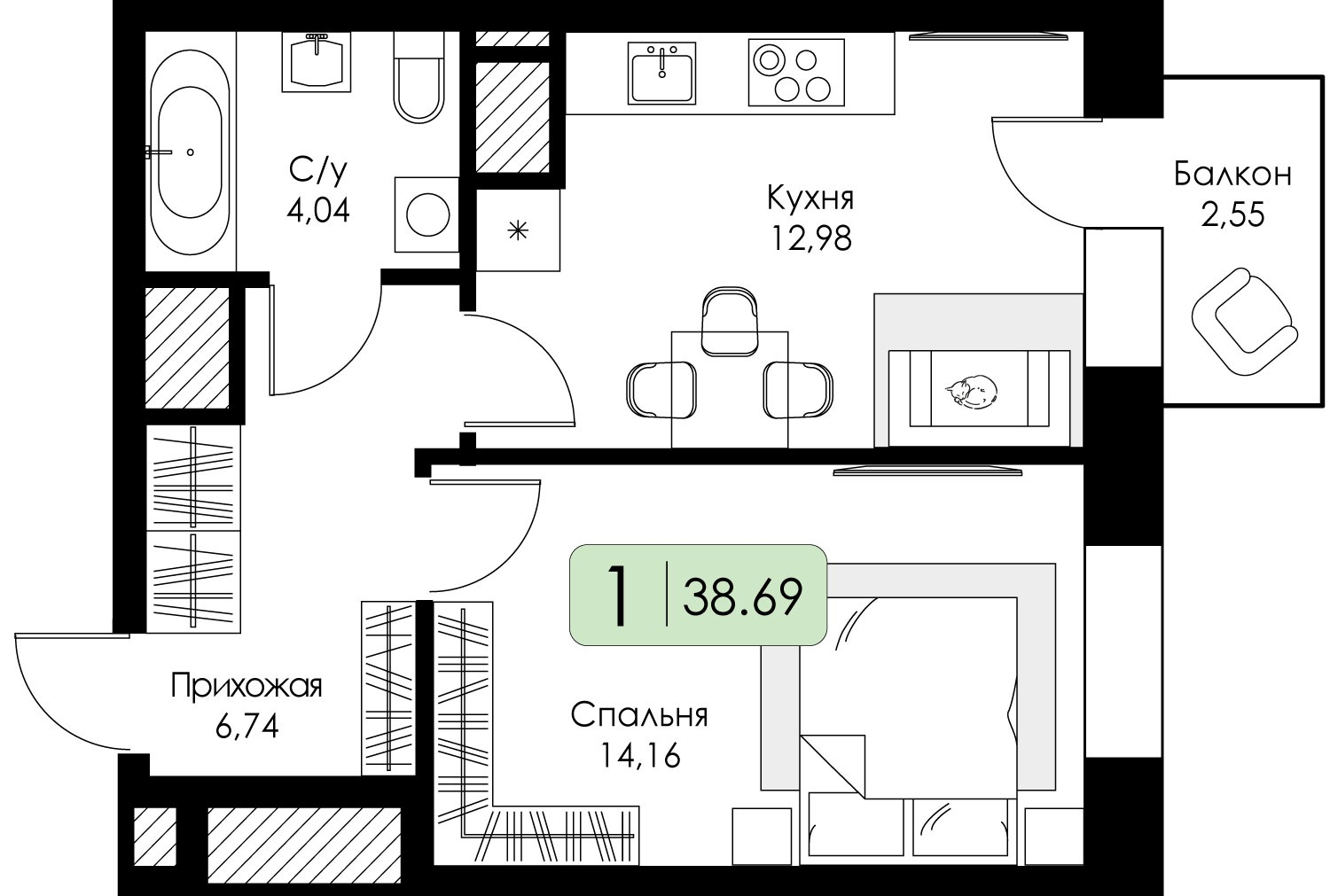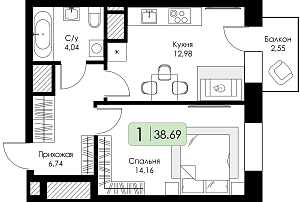Однокомнатная квартира №50 с предчистовой отделкой, Корпус 1, Секция 1
