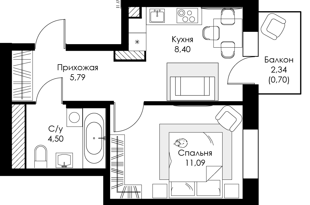 Однокомнатная квартира №54 с чистовой отделкой, Корпус 2, Секция 1