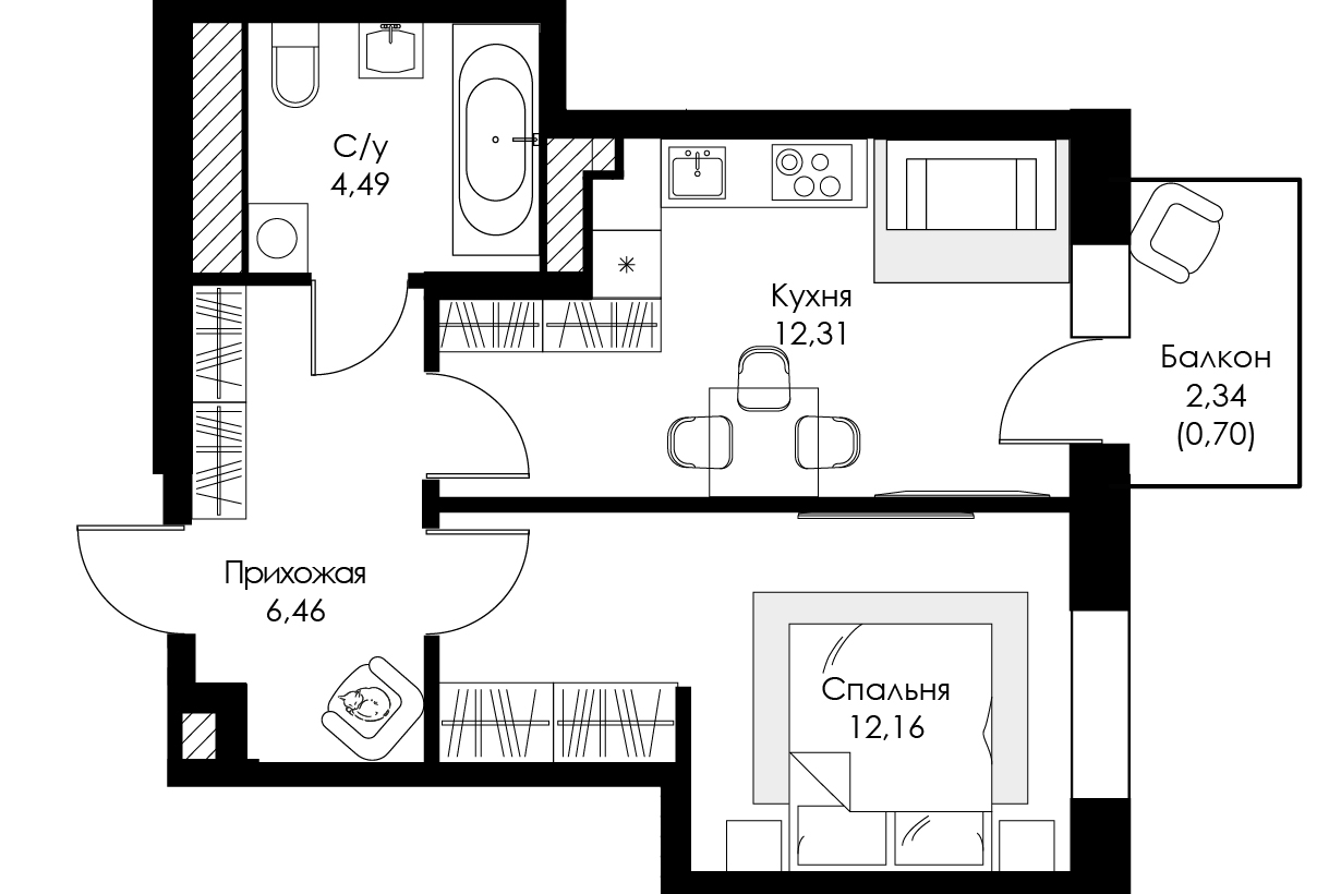 Однокомнатная квартира №55 с чистовой отделкой, Корпус 2, Секция 1