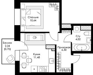 Однокомнатная квартира №50 с чистовой отделкой, Корпус 1.1, Секция 1