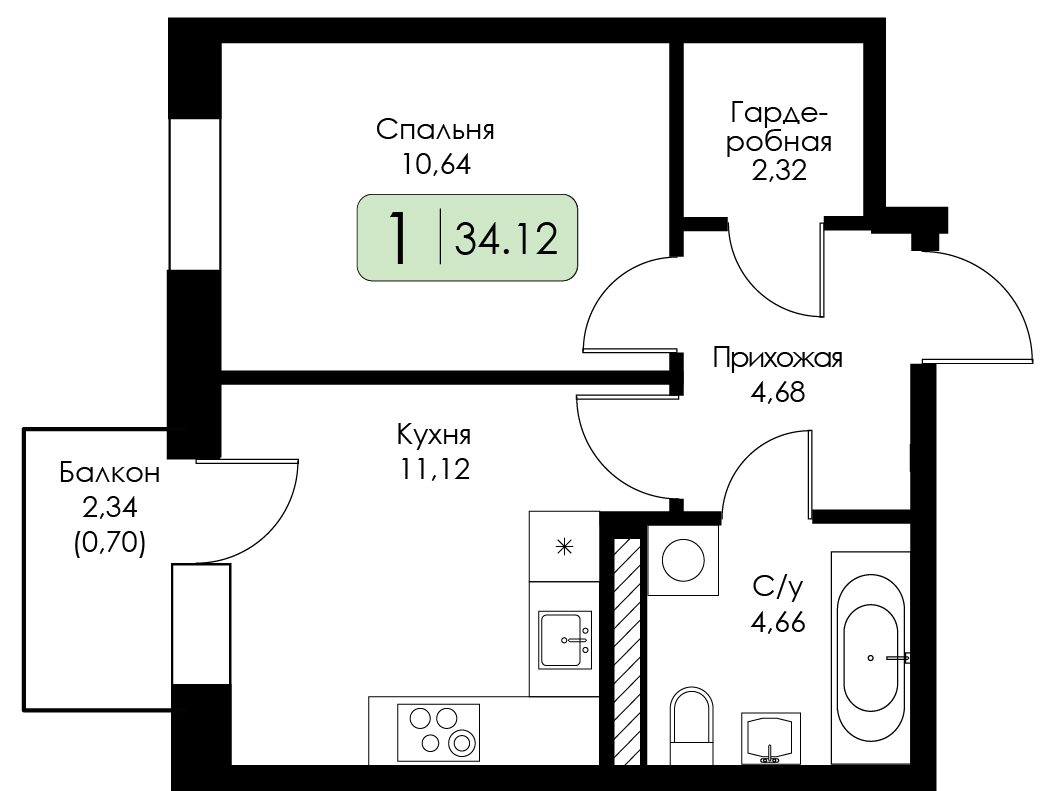 Однокомнатная квартира №59 с чистовой отделкой, Корпус 1.1, Секция 1