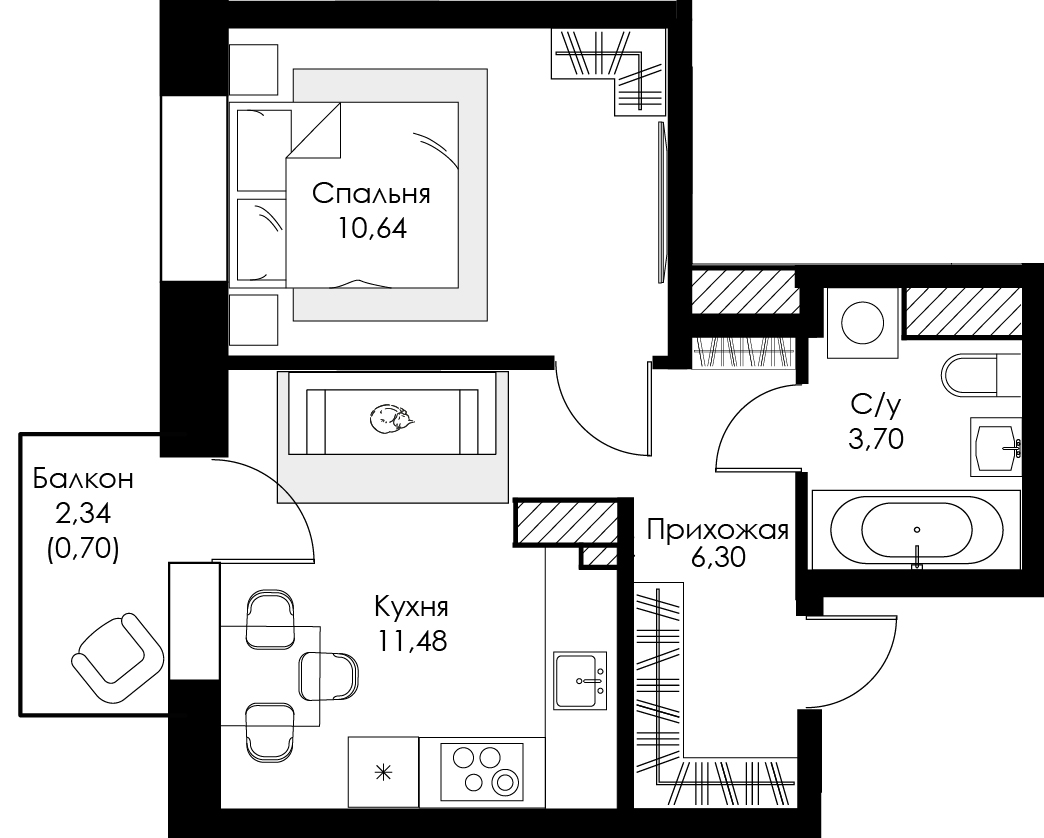 Однокомнатная квартира №160 с чистовой отделкой, Корпус 1.1, Секция 1