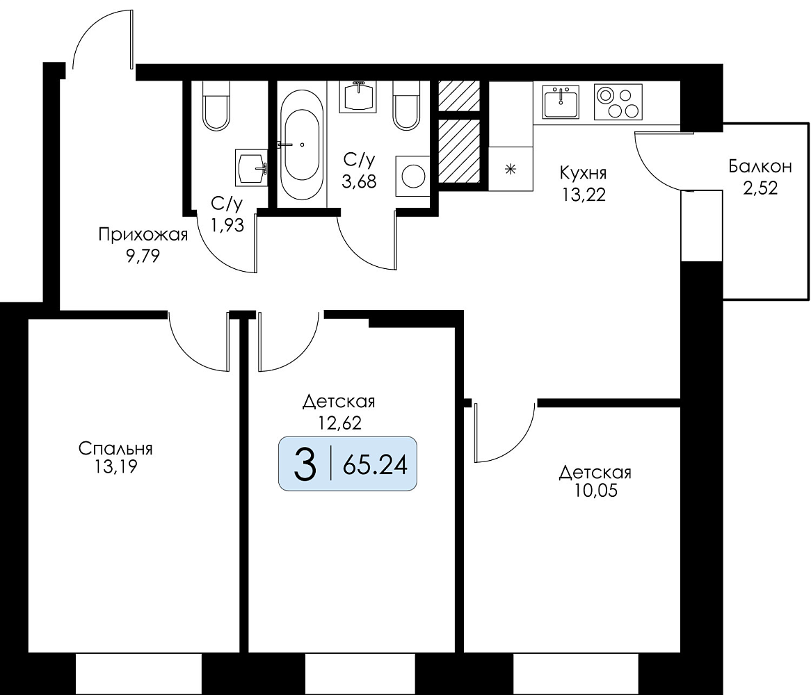 Трехкомнатная квартира №91 с чистовой отделкой, Корпус 1, Секция 1