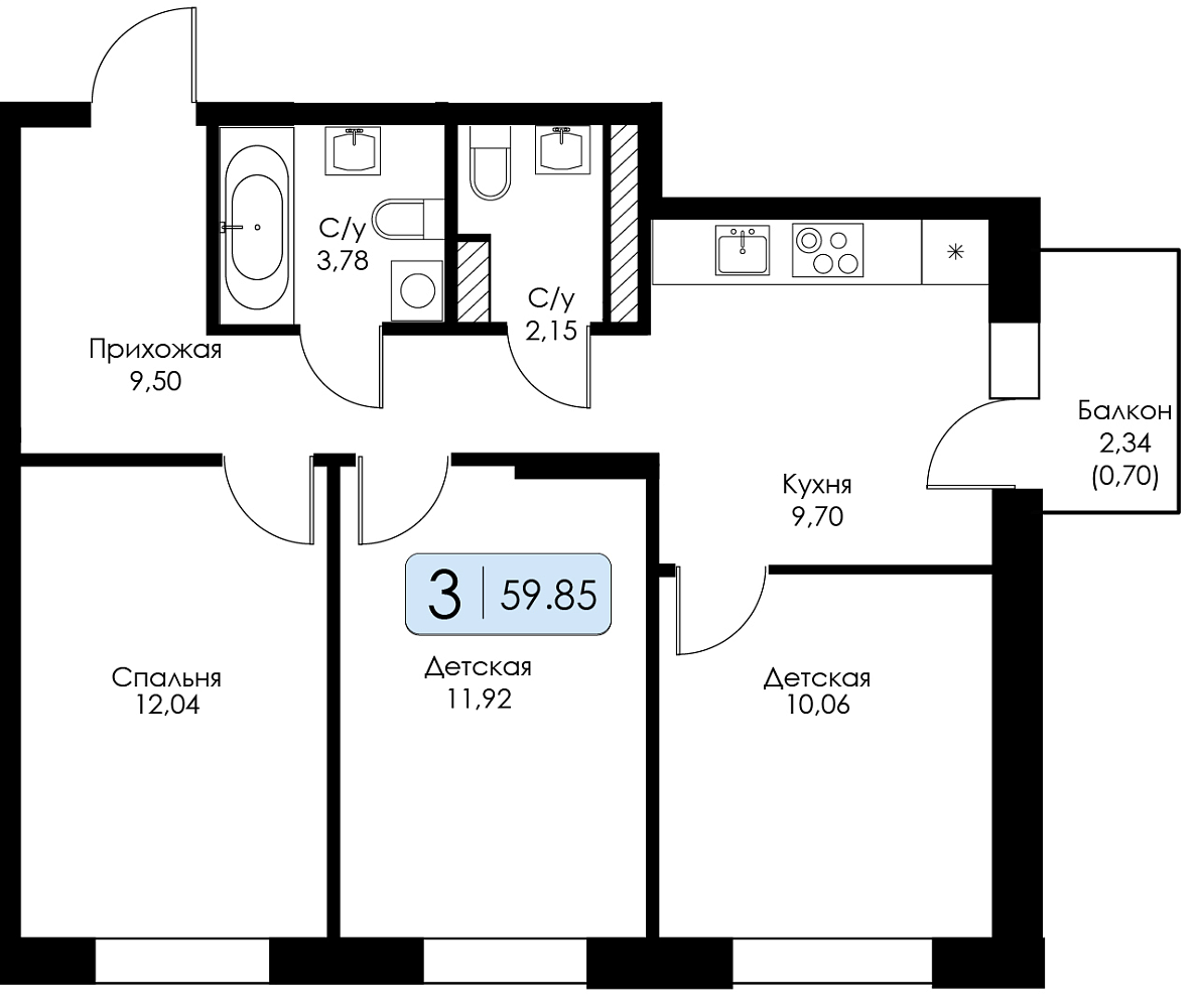 Трехкомнатная квартира №133 с предчистовой отделкой, Корпус 1.1, Секция 1